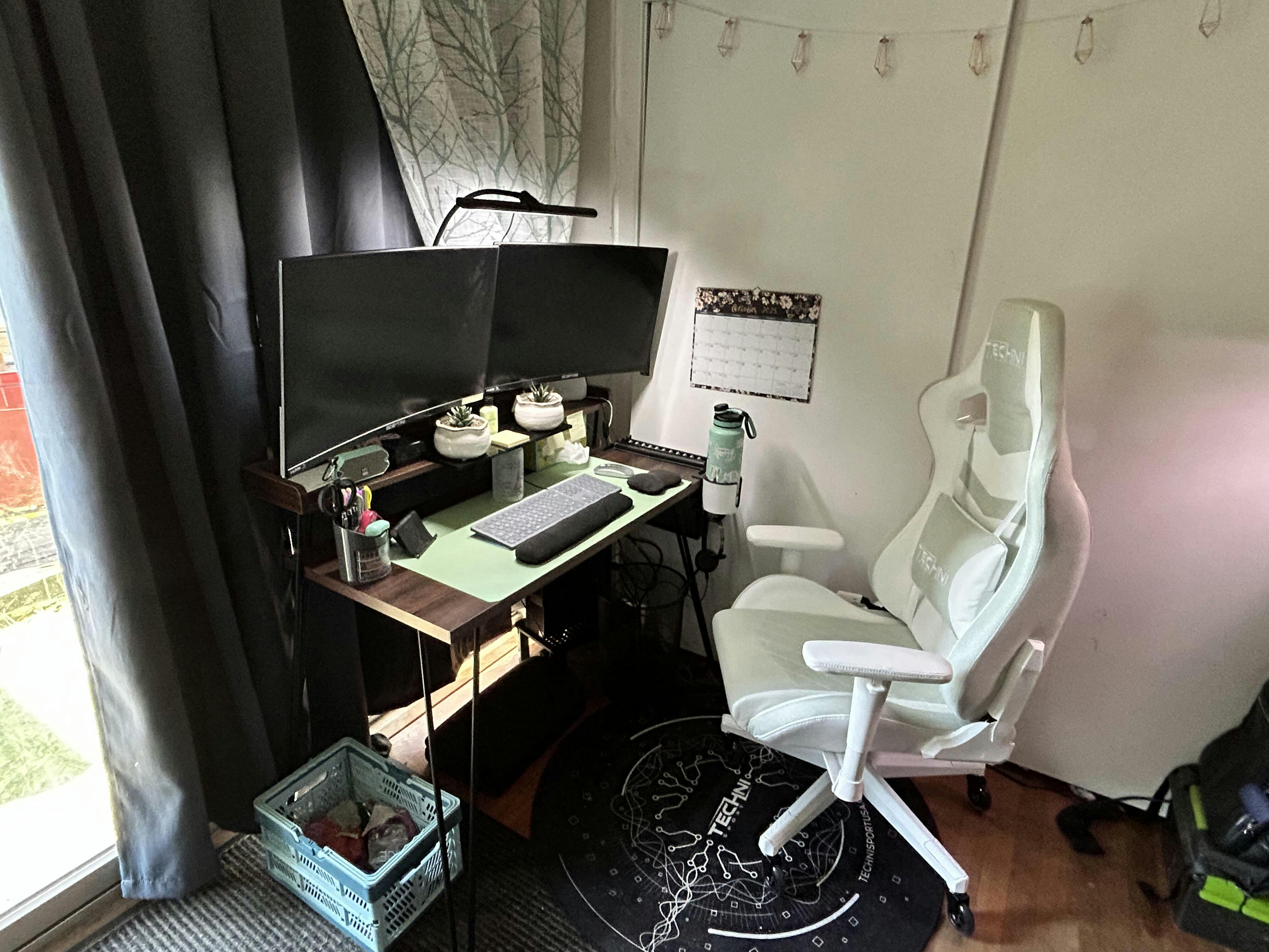 First off, even with my complaint, this is a damned comfortable chair. All their chairs are rated for 250# and up, but apparently not for folks with some thunder in the thigh region. It hugs the thighs, which ends up for some sore legs while it’s breaking in. Even using a foot rest to raise my legs and take some pressure off, it gets uncomfortable after a few hours. Guess I really need to hit the gym, huh?